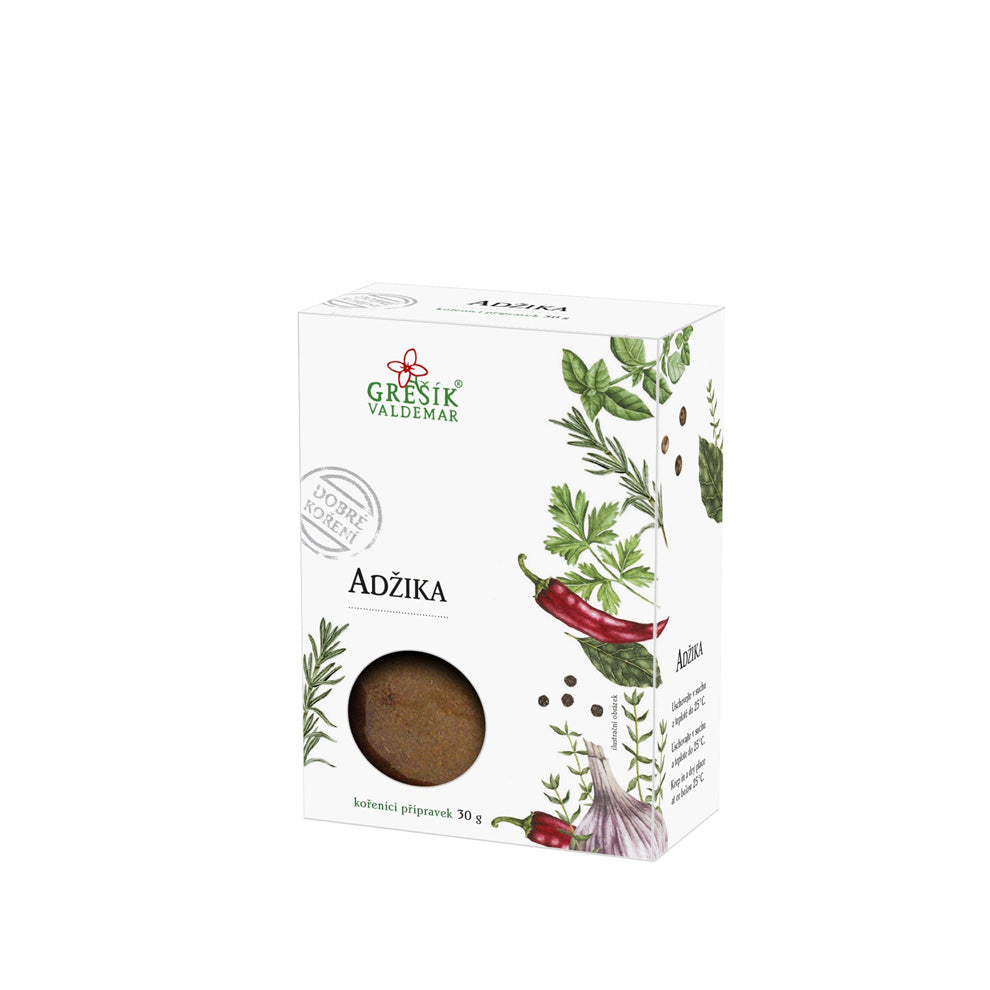 Adžika je kavkazské, aromatické, ne příliš ostré koření, vhodné na dušená a pečená masa, grilování kuřat a do masových směsí. Složení: paprika, koriandr, kopr, jedlá sůl (max. 13 %), česnek, bazalka, pískavice, máta, bobkový list, majoránka, celer, petržel, saturejka, chilli Výrobek obsahuje celer.
