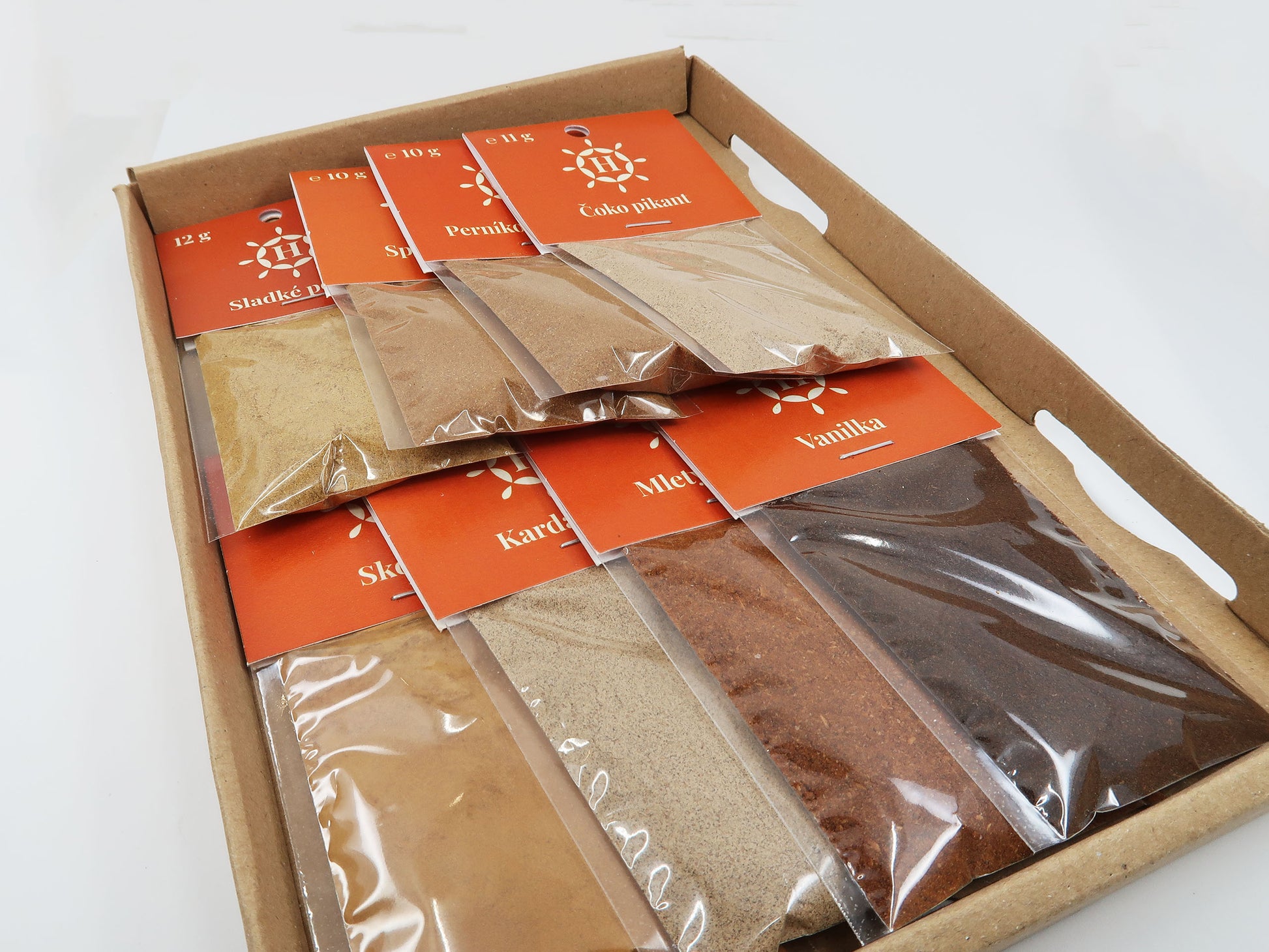 Sada obsahuje poznávací pytlíčky 4 různých směsí a 4 jednodruhových koření: